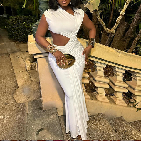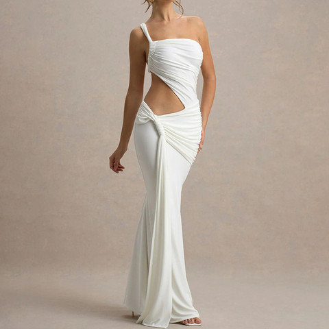 女式优雅不规则褶裥性感单肩剪裁马克西连衣裙时尚无袖垂褶修身派对长晚礼服